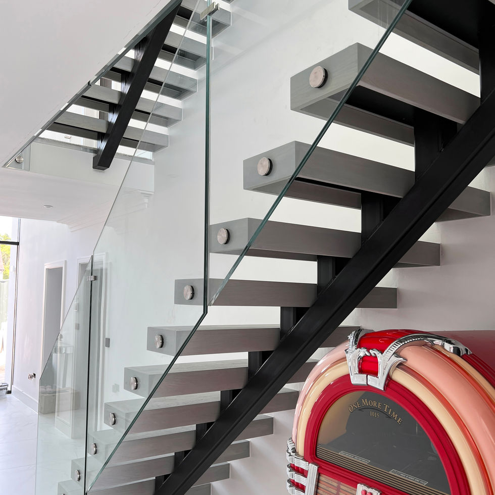 This pair of spine staircases employs open oak step boxes, secured to the central steel stringer and finished grey, housing LED strips for bottom-lighting. Framed with clear glass balustrades, our fitters also installed a series of frosted glass balconies framed with clamps on posts, bolts, and in a Juliet-style at their respective galleries, as well as clear glass windows.