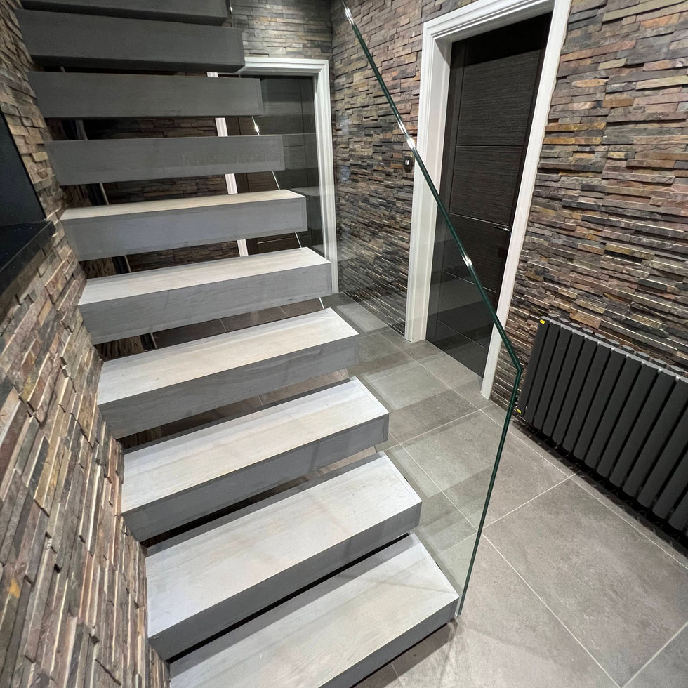 Punctuating the volcanic stone walls, our team installed floating oak stairs painted grey painted grey to extend the reach of the grey tiles and complement the unique stone walls. Bolted glass balustrades lining the staircase and landing at the top of the flight.