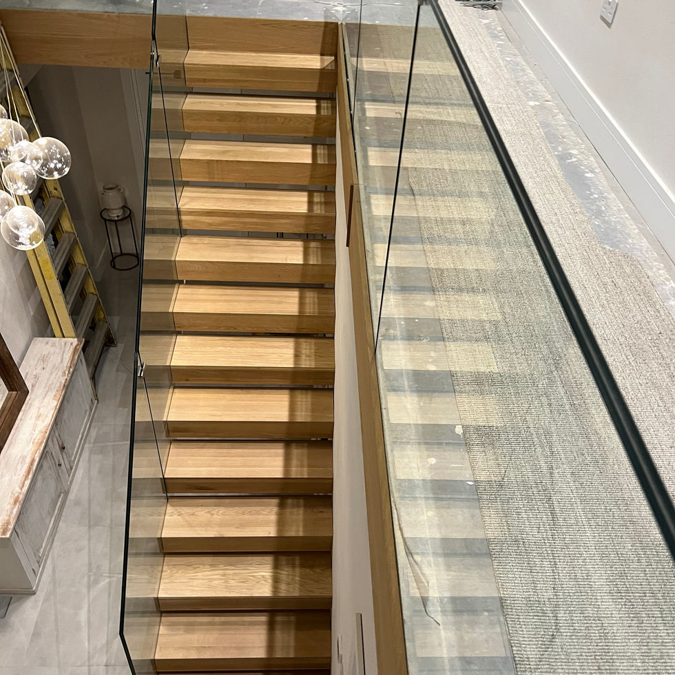 This natural colour oak floating staircase was installed with side cladding lining the straight glass balustrades along the sides of the steps and along the landing. Reflecting both the shimmering lights hanging overhead and the great outdoors, this rustic staircase perfectly complements the simple white walls and pastoral decor.